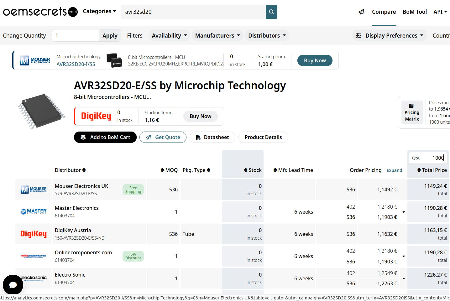 Preislich kommt dies hin – die folgende Abbildung zeigt eine OEMSecrets-Preisanalyse. Weitere Informationen, Datenblätter und Co finden sich derweil unter der URL https://www.microchip.com/en-us/products/microcontrollers-and-microprocessors/8-bit-mcus/avr-mcus/avr-sd .