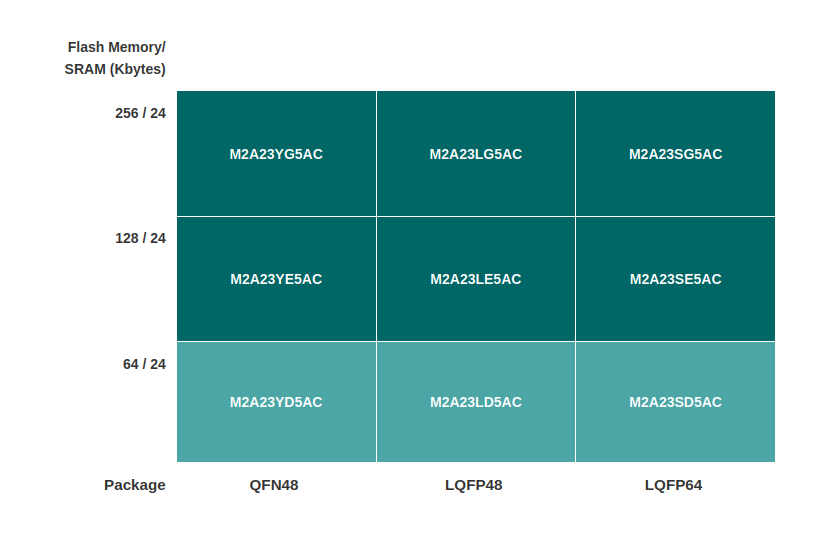 The M2A23 series is equipped with an Arm Cortex-M23 core, with a maximum operating frequency of 72 MHz |