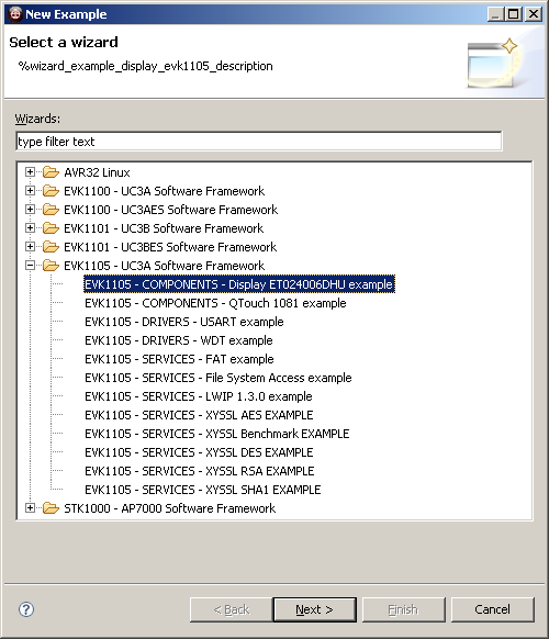 Im AVR32-Studio sind einige Beispiele zum ATEVK1105 enthalten, die Verwendung soll hier beschrieben werden.