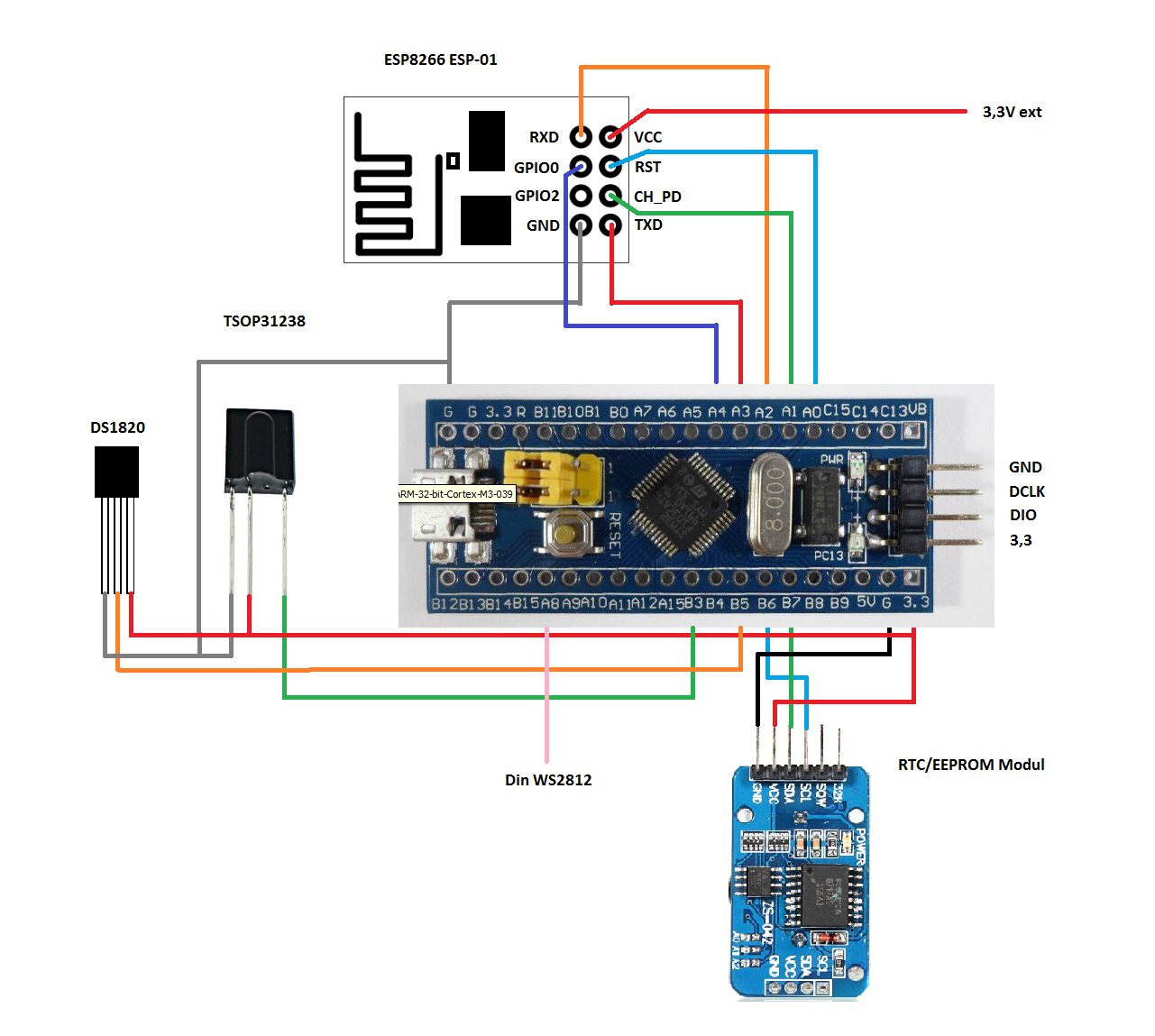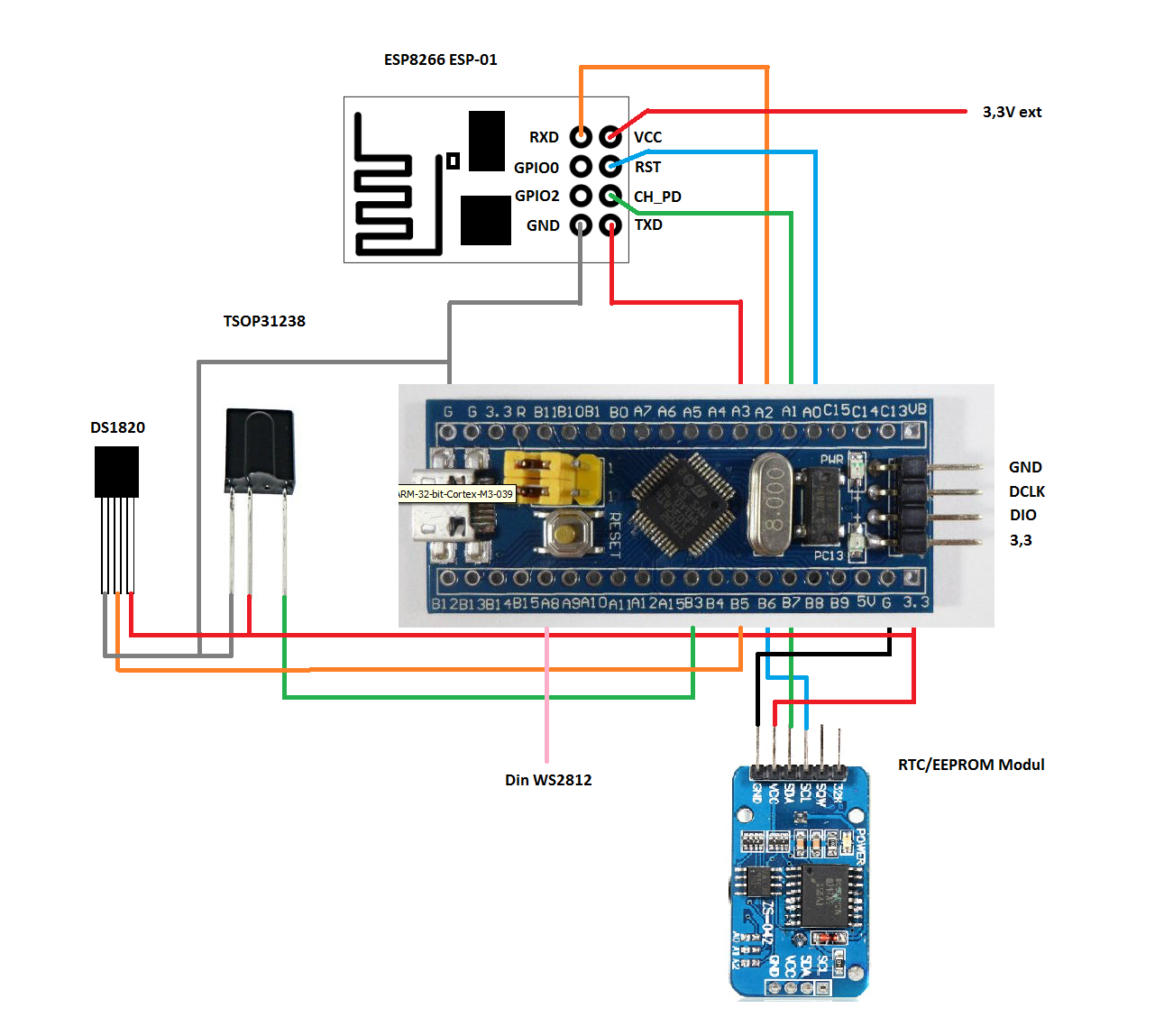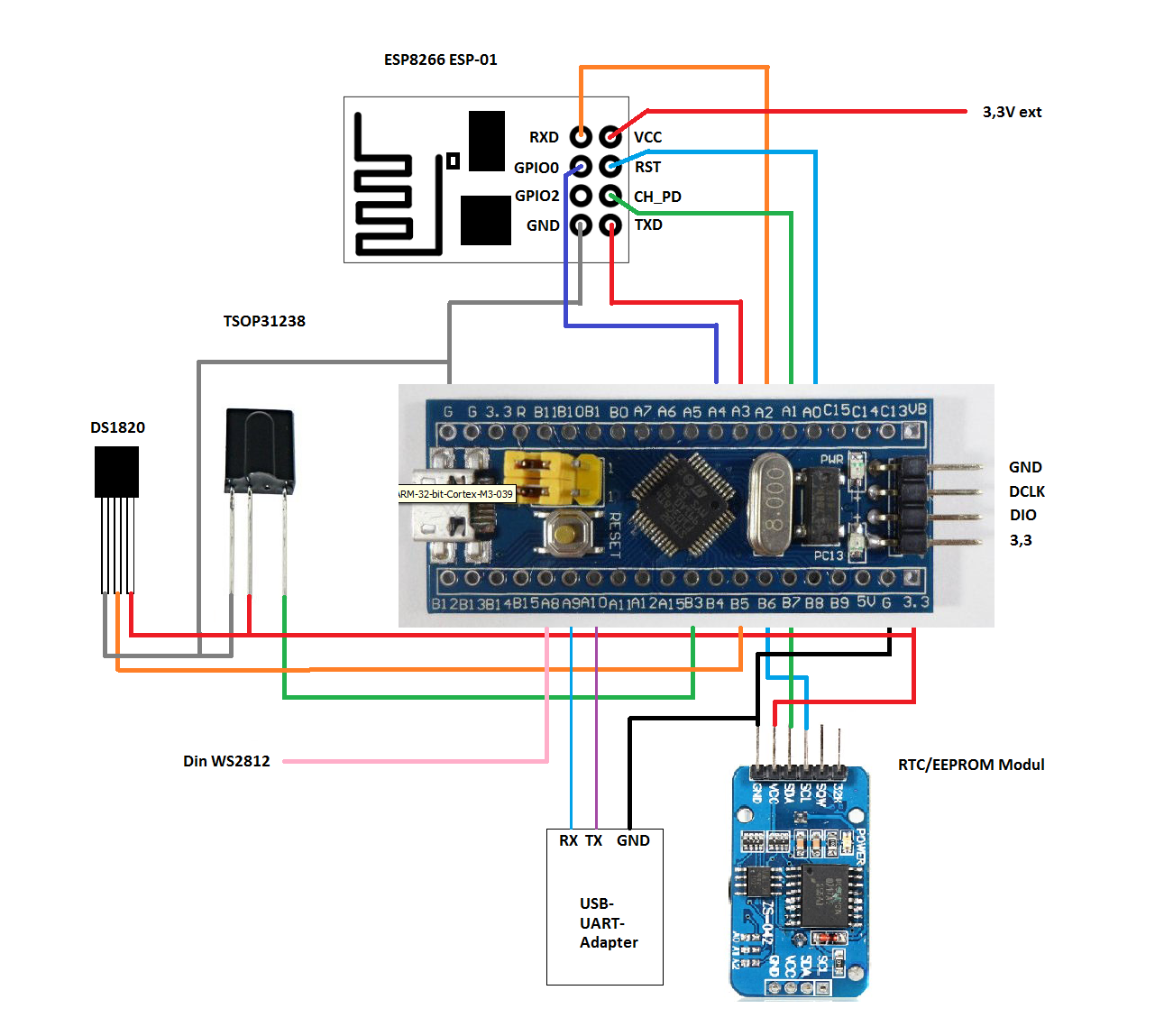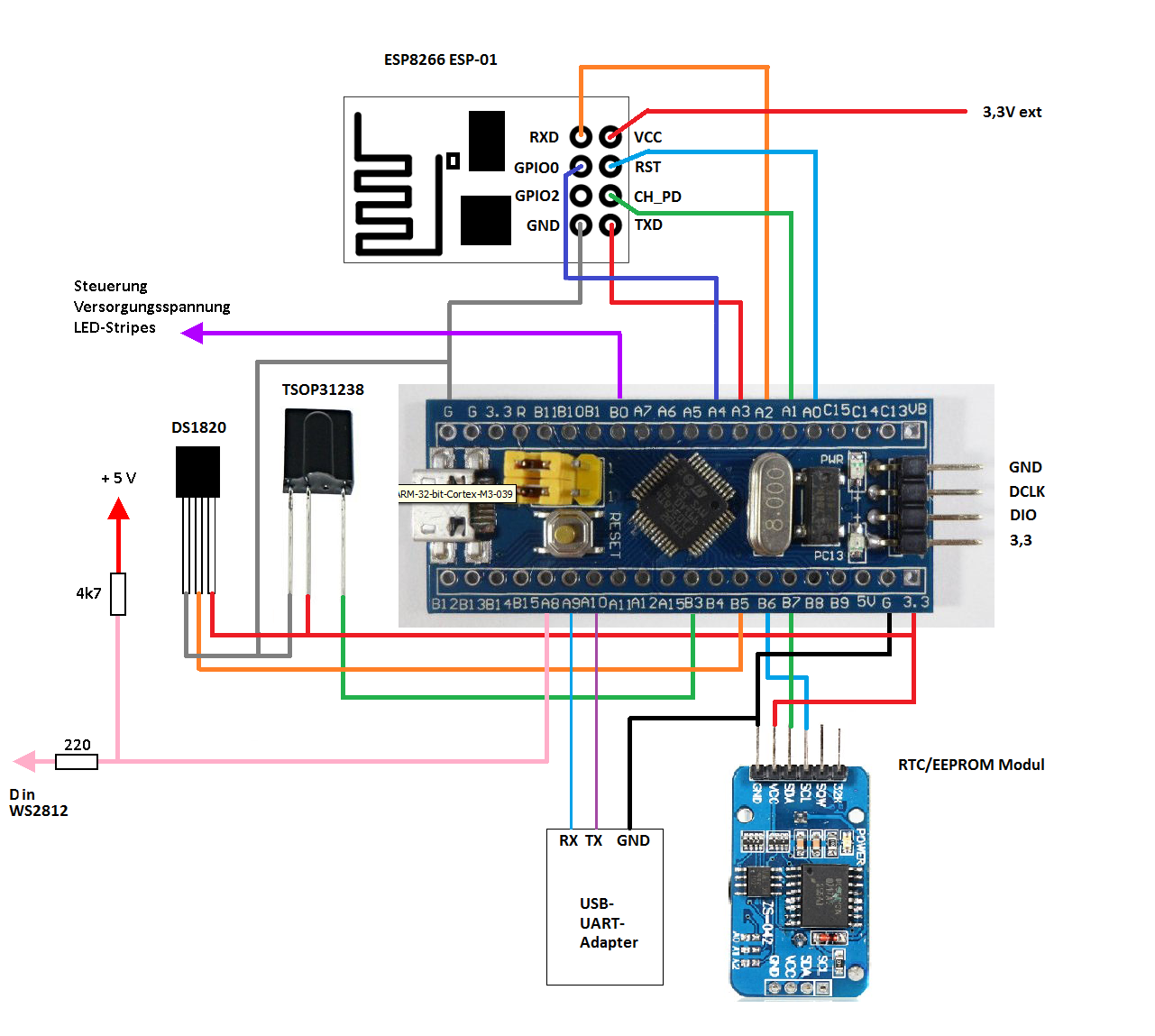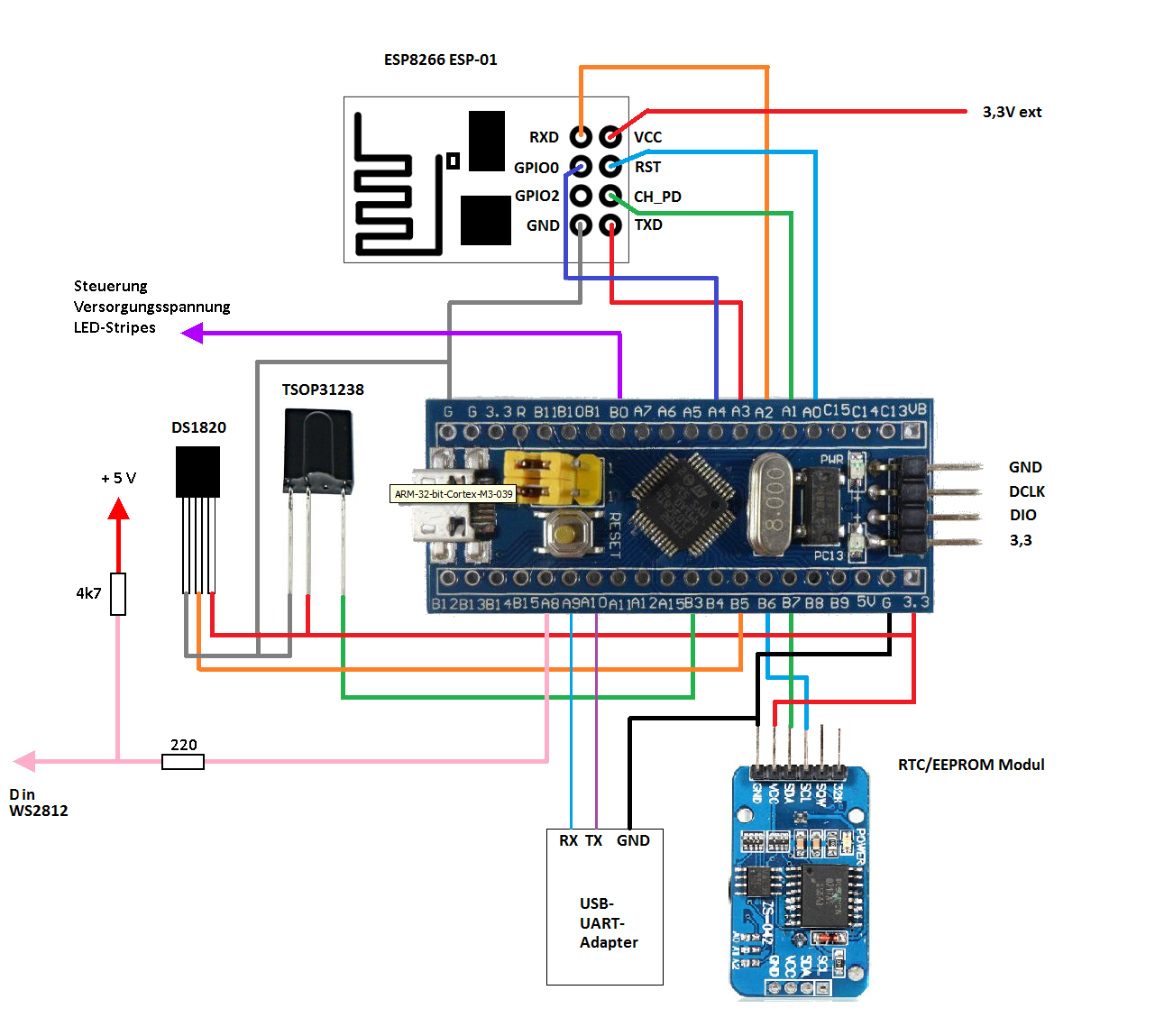 Anschluss-Skizze WordClock an STM32F103 Mini Development Board
