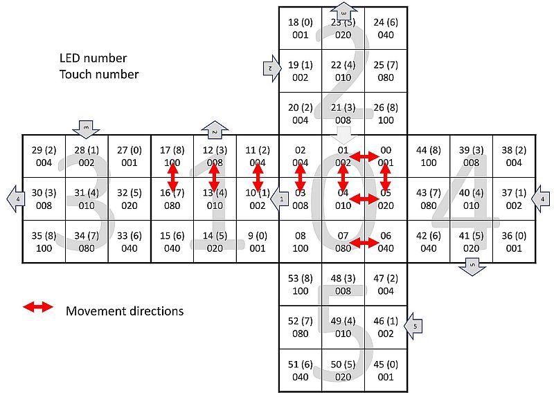 Darauf basierend generiert die IDE eine Bibliothek, die dann in der Software per API auf die Funktionen zugreift. Das Slave-Projekt ähnelt sehr dem eingangs erwähnten CapSense Beispiel, es müssen ja lediglich 9 Touch-Felder eingelesen und die Information per I2C-Slave bereit gestellt werden. Das Master-Projekt hingegen, muss alle Slave-Informationen per I2C-Master einholen, die 54 WS2812B-LEDs ansteuern (serieller Datenstrom per SPI generiert) und ... besitzt die gesamte Intelligenz. Hierzu bekommt jede LED und jede Touch-Fläche eine entsprechende ID, um sie zu adressieren.