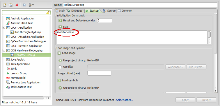- Im Startup Tab ist in das freie Feld bei Initialization Commands monitor erase einzutragen