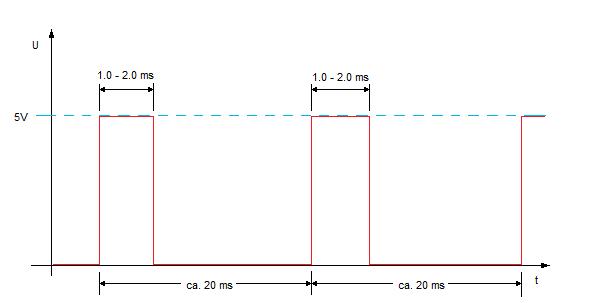 Das Signal, das an den Servo geschickt wird, hat eine Länge von ungefähr 20ms. Diese 20ms sind nicht besonders kritisch und sind ein Überbleibsel von der Technik mit der mehrere Kanäle über die Funkstrecke einer Fernsteuerung übertragen werden. Für das Servo wichtig ist die Impulsdauer in der ersten Phase eines Servosignals. Nominell ist dieser Impuls zwischen 1ms und 2ms lang. Wobei das jeweils die Endstellungen des Servos sind, an denen es noch nicht mechanisch begrenzt wird. Eine Pulslänge von 1.5ms wäre dann Servomittelstellung. Für die Positionsauswertung des Servos haben die 20ms Wiederholdauer keine besondere Bedeutung, sieht man einmal davon ab, dass ein Servo bei kürzeren Zeiten entsprechend öfter Positionsimpulse bekommt und daher auch öfter die Position gegebenenfalls korrigiert, was möglicherweise in einem etwas höheren Stromverbrauch resultiert.