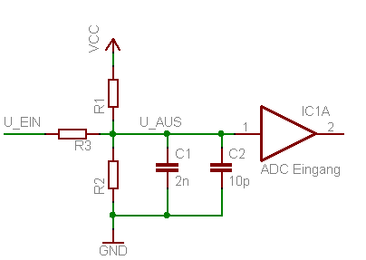 Nachfolgend ist eine praktische Schaltung des Spannungsteilers mit einem AVR-Mikrocontroller gezeigt. Prinzipiell gilt sie natürlich für jeden Mikrocontroller bzw. ADC. Wichtig ist hier der Kondensator C1. Dieser ist notwendig, um kurzzeitig Strom zu liefern, wenn der ADC das Eingangssignal abtastet. Leider sinkt damit auch die obere Grenzfrequenz (siehe Formel für [math]\displaystyle{ f_\text{3 dB} }[/math]). Hier muss ein Kompromiss aus Grenzfrequenz, Ausgangswiderstand und Messfehler gefunden werden. Der Kondensator C2 ist kein diskret platziertes Bauteil, er symbolisiert vielmehr die unvermeidliche Eingangskapazität des ADC.
