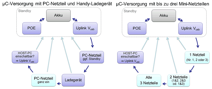 Wenn das System über USB vom Host gesteuert wird, verhält sich das Gerät in der Regel wie ein "self-powered USB-device". Im Standby-Betrieb nutzt das System je nach Verfügbarkeit ggf. 100mA oder 500mA vom USB-Uplink zum Host-PC, um den Akku geladen zu halten. Wenn POE nicht verfügbar ist kann das System bei niedrigem Ladestand des Akkus über die 230V-Relaisbox auch eines der Netzteile einschalten, um sich dann aus dem Netzteil mit Strom für eine Akku-Schnelladung zu versorgen.