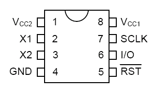 SCLK, I/O und /RST dienen der seriellen Kommunikation. X1 und X2 stellen die