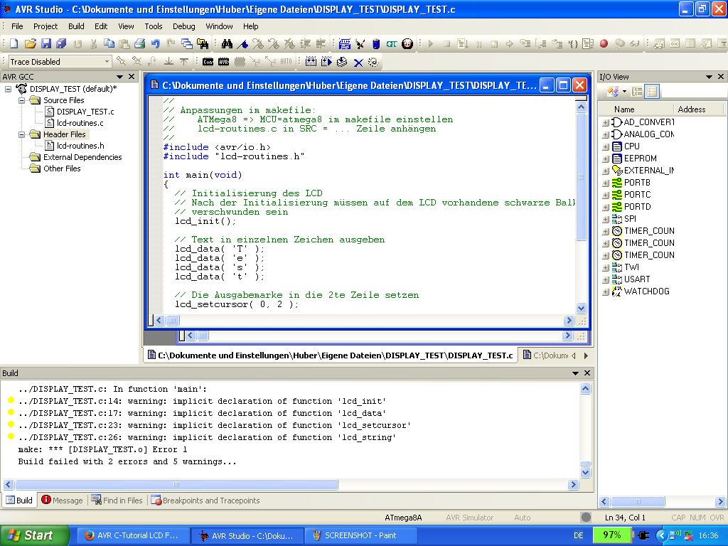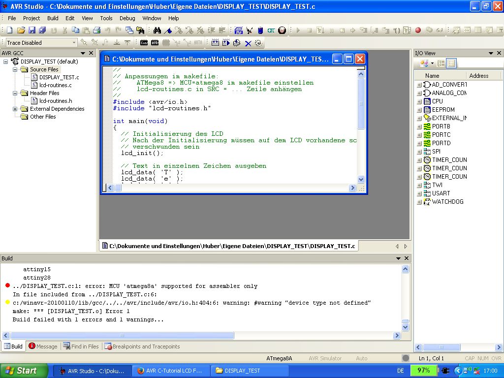 Hallo, so jetzt habe ich mir das AVR Studio 4.18 zugelegt. und ich bin begeistert :-). Und ich will auch dieses tutorial machen. [[https://www.mikrocontroller.net/articles/AVR-GCC-Tutorial/LCD-Ansteuerung]] habe mir dazu auch die zwei Dateien gespeichert. lcd-routines.c , lcd-routines.h . Dann mit rechts klick die .c Datei in Source files und die .h Datei in den Header file ge-added - und die Hauptdatei LCD beispiel 1 als Hauptprogramm halt. allerdings bekomme ich beim übesetzen folgenden fehler code :-( . Was mache ich denn da falsch?