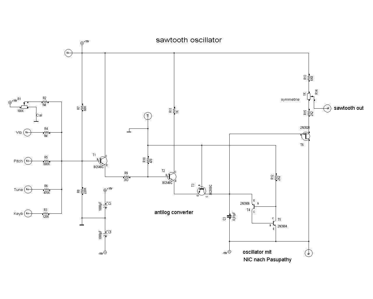 Hallo Franz, Ich kenne das Buch "negative Widerstände in elektronischen Schaltungen" von Bening, das ich im Antiquariat für 1€ erhalten habe - ursprünglich aus dem VEB Verlag Technik DDR. Darin sind eine Menge Schaltungen mit NICs (Negativ Impedanz Convertern) beschrieben zum Aufbau von Oszillatoren. Eine Schaltung, die man auch mit Google (Bilder) finden kann und in einigen Büchern, arbeitet mit einem NIC, um damit einen Oszillator aufzubauen. Ich habe damit einen spannungsgesteuerten Oszillator für den Einsatz in Synthesizern gebaut, der Frequenzen von unter 1 Hz bis über 20 Khz erzeugen kann. Für höhere Frequenzen braucht man für diesen NIC schnellere Transistoren - etwa die Typen 2N2368 und 2N2906. Gruß Thomas