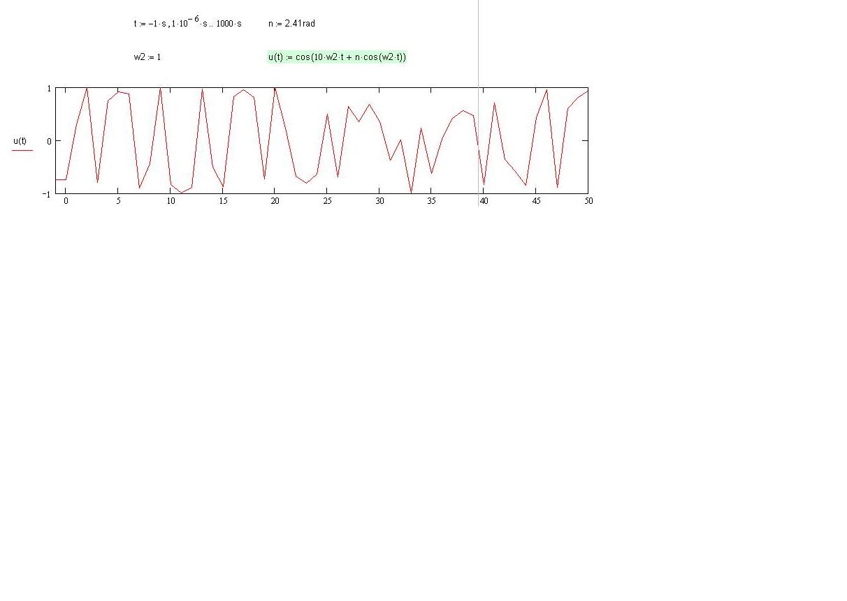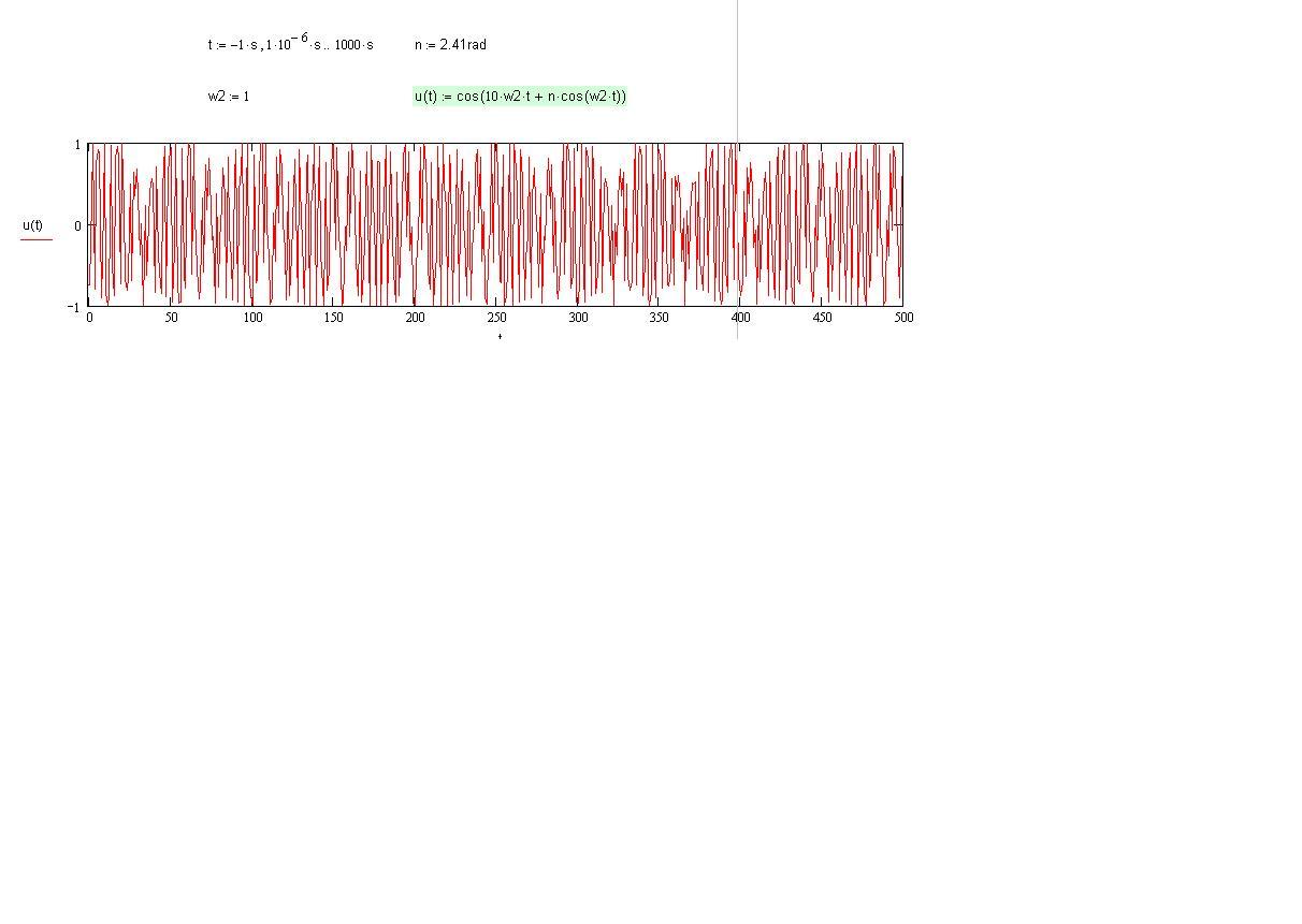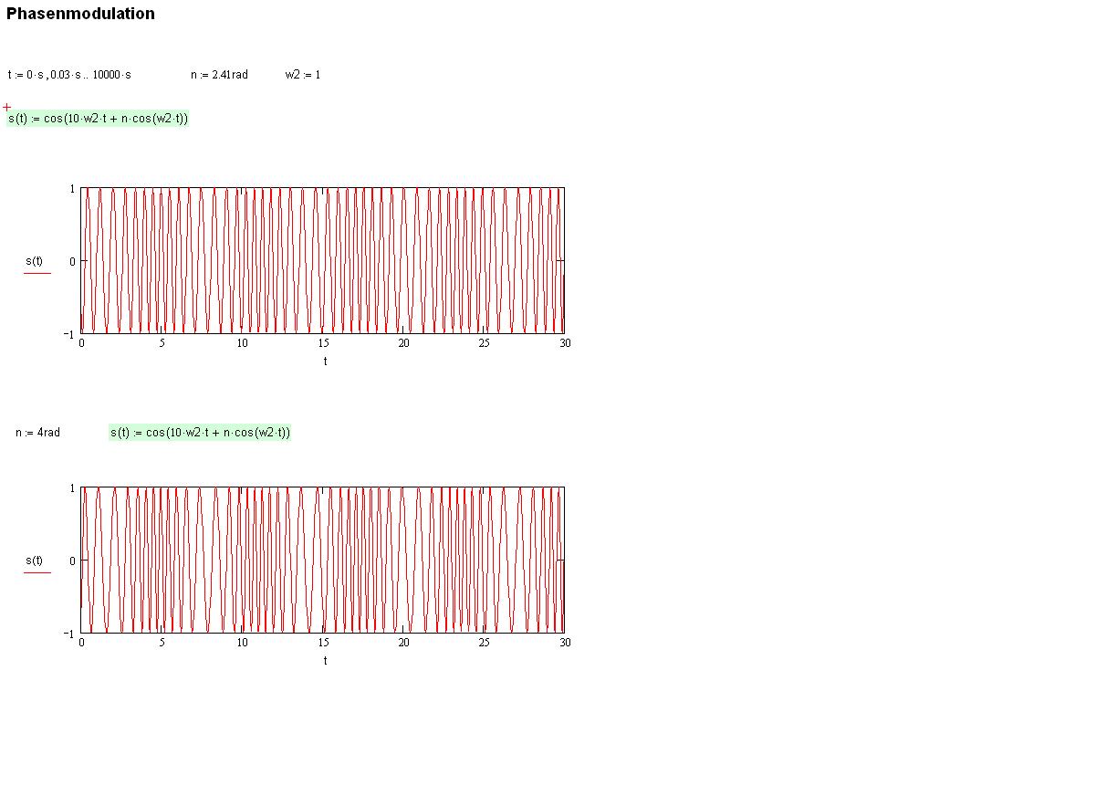 Folgendes: Das Signal s(t)=cos[w1*t+eta*cos(w2*t)] soll grafisch dargestellt werden. Angaben: eta=2,41 rad w1=10*w2 Fragen: 1.) grafische Darstellung 2.) Welche Frequenzen sind in s(t) enthalten (vielfache von w2)? 3.) Welche Bedeutung hat eta? Meiner Meinung nach muss w2 gegeben sein um s(t) darstellen zu können. Oder liege ich da falsch?