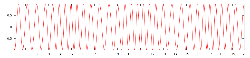 So sieht eine Phasenmodulations aus (w1=10, w2=1, eta=2,41). Die Schrittweite bei der Berechnung der Kurve ist 0,02. Wählt man sie deutlich gröber, wird das Ergebnis gezackt bis unkenntlich, weil dann auf jeder Schwingung zu wenig Stützpunkte liegen.