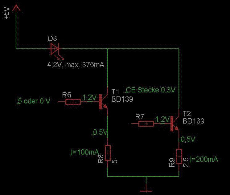 Moin zusammen, Bin grad in eagle einen Schaltplan am entwerfen für meine Wetterstation. Da ich die Hintergrundbeleuchtung noch garnicht benutzt hatte und es jetzt in angriff nehmen wollte hab ich mir folgendes überlegt. Und zwar soll per µC (mega32) verschiede Helligkeits stufen eingestellt werden können und ich hab noch 2 Bits frei das heißt 4 verschieden zustände. also da hätten wir 0 0 = aus 1 0 = "wenig" an ca 100mA 0 1 = "mittel" an ca 200mA 1 1 = "Maximum" an 300mA Ich hatte vor das mit 2 transistoren so lösen und hab den schaltplan so aufgebaut. Könnte das funktionieren oder gibt es da eine elegeantere lösung ? Gruß Sebastian
