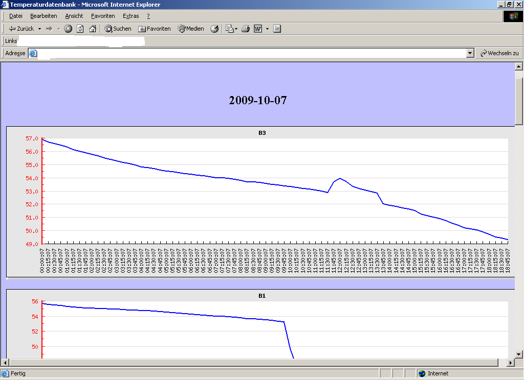 Hallo alle zusammen, ich habe jetzt mal meinem Schwager meine Problematik erklärt und er hat sich der Sache mal angenommen. Ich wollte euch nur auf dem laufenden halten und hier mal meine jetzige Variante darstellen. Ich hoffe das klappt hier mit den Bildern einfügen. Also, er hat irgendwas in PHP geschrieben, auf Basis von Digitemp. Ich logge mich per Web-Browser auf den Server ein (mit Zugangsdaten) und erhalten dann den Srceenshot Modulauswahl, hier kann ich bestimmen ob ich mir einen Monat oder einen Tag ansehen möchte. Danach kommt die Tages bzw. Monatsauswahl, in der ich per Scroll-Button den entsprechenden Tag bzw Monat wählen kann. Dann werden Daten in einem Diagramm (siehe Anhang: Ansicht) angezeigt, in dem für jeden Sensor ein Diagramm dargestellt wird. Im Moment sind die Sensoren noch nicht sortiert und beschriftet, folgt aber dann. Zur Zeit lese ich alle 15 Minuten aus (die 10 Sensoren ,der Rest folgt noch, sind ja am Pufferspeicher installiert) In der Tagesauswahl sieht man die Temperatur zur entsprechenden Uhrzeit, in der Monatsauswahl gibt es auch für jeden Sensor ein Diagramm, welches den Durchschnitt des Sonsors an dem entsprechenden Tag anzeigt. (bei Bedarf poste ich noch einen Screenshot davon) Dies ist nur die erste Version, mein Schwager hat mir noch ein paar nette Spielereien versprochen. Was auf jeden Fall noch kommt, ist ein Multidiagramm (frei definierbar für bestimmte Sensoren) Also ich bin erst mal hoch zufrieden und es klappt jetzt schon mal sehr gut. Viele Grüße Björn