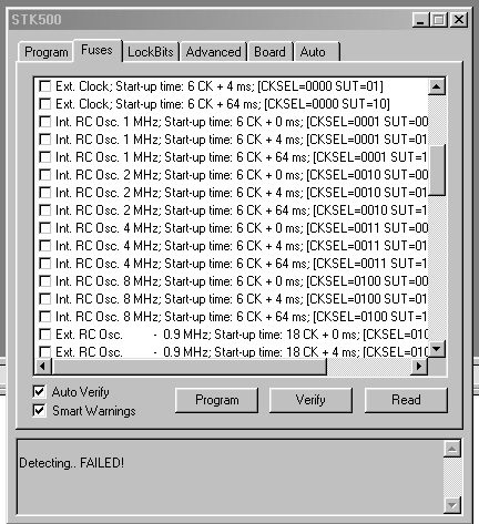 Hi! Ich hatte das selbe Problem auch schon..leider habe ich es immer noch, da mir noch niemand helfen konnte/wollte. Mir wurde gesagt, das ich das Datenblatt lesen soll... Doch leider kann ich daraus nicht viel entnehmen. In der einen Tabelle steht das man ab soundsoviel mhz eine ander Einstellung machen soll usw... Ausserdem weiss ich langsam nicht mehr ob ich alles invertiert eingeben muss oder nicht. Ponyprog hat da irgendwie was anders...und ich weiss nicht wie es genau in Bascom geht. Aber vielleicht hast du genau wie ich die Fusebits das Erste Mal auf externen takteingang eingestellt.(rechtecksignal) Bei mir war das der Fall und ich habe mir mit dieser Schaltung(http://mypage.bluewin.ch/nikbamert/rechteck.html) geholfen um die Fusebits wieder auf intern einzustellen...so könntest vieleicht deinen futschen atmega retten. (bei mir wars übrigens auch beim atmega16 danach konnte ich ihn weder programmieren, noch ein programm laufen lassen...) MFG Nik