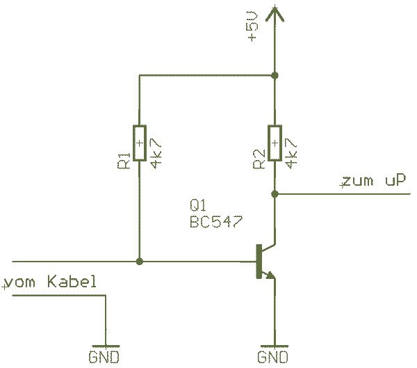 @sven: mit der ascii-Schaltung warst du zwar etwas schneller, ich würde aber auch an der Basis einen Pull-Up anbringen, da die Basis sonst in der Luft hängt und über das Kabel Störungen einfangen könnte. Der Serienwiderstand in der Kabelleitung ist in Verbindung mit den internen Schutzdioden eine sinnvolle Ergänzung meiner Schaltung. grüsse leo9