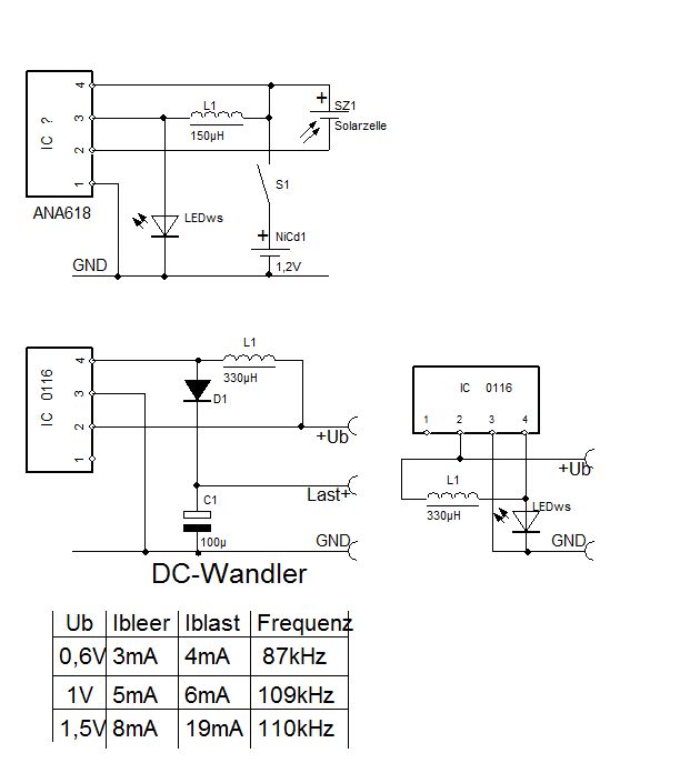 Ich habe zwei Geräte mit ähnlichen IC's: LED Solarleuchte mit 0116 Ente mit Solarzelle und Bewegungsmelder, Ente quakt und 2 LED leuchten, ein ANA618 ist verbaut. Mit dem 0116 konnte ich einige Versuche anstellen. Betriebsspannung von 0,6V bis 2V, Ausgangsspannung Leerlauf bis 12V. Ein Lastwiderstand 470 Ohm bewirkt eine Ausgangsspannung 2,8V, Eingangsspannung 1,5V, Wirkungsgrad ungefähr 80%. Drosseln mit 330µH bis 51mH verändern die Ausgangsleistung kaum. Die Schaltfrequenz liegt um die 100kHz.