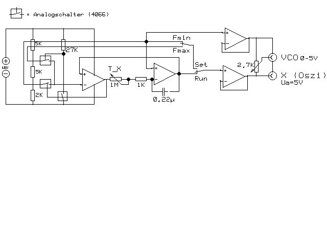 Hi! Habe es schnell mal gezeichnet->Anhang Erzeugt aber Dreieck, weil zum wobbeln besser geeignet. Den Spannungsregler habe ich allerdings vergessen. Die 12V müssen jedenfalls stabiel sein.(Schaltschwellen) Ach ja und als OV LM324 oder 2xLM358 Fet-OV's gehen nicht gut weil die untere Schaltschwelle nur 2V von GND weg ist. Der X-Ausgang bringt 5V. Wenn du also am Oszi(X) 0,5V einstellst, werden in X-Richtung 10 RE erzeugt. Wenn der eine Umschalter auf "SET" steht und der andere auf Fmin stellst du an deinem Generator die minimale gewünschte Frequenz ein. Danach schaltest du auf Fmax und stellst mit dem "VCO"-Poti die maximale ein.Wenn du jetzt auf RUN gehst ist ganz links Fmin und ganz rechts Fmax und jede RE entspricht Delta F / 10. zB.: DCF-Antenne Soll = 77,5kHz Fmin = 77kHz Fmax = 78kHz Der "Resonanzbuckel" muss dann genau in der Mitte des Bildschirms sein.(oder die Antenne ist daneben) Alles klar? Was ich gerade überlege, mit X-Eingang meinst du doch hoffentlich X-Eingang in XY-Mode und nicht etwar externes Triggern? - dann kannst du das alles vergessen. Nochwas! Du musst erstmal schauen in welchem Bereich dein Generator die "VCO-Spannung" linear verarbeitet,kann sein du musst dem VCO-Poti noch einen Vorwiderstand verpassen. MFG Uwe