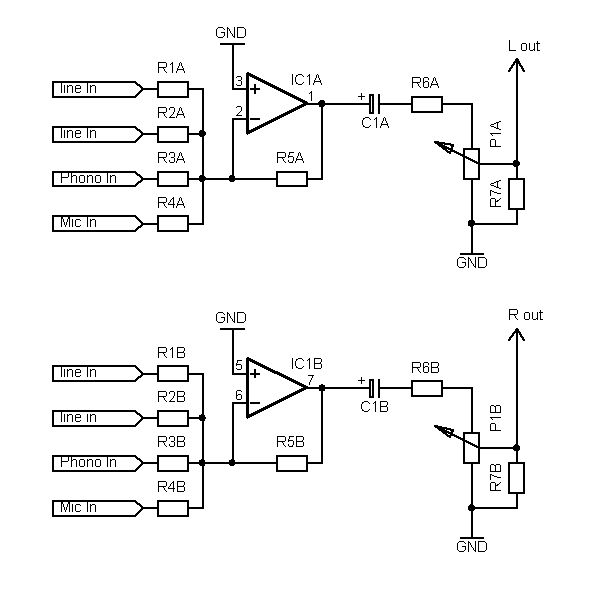 Hallo habe dir mal auf die schnelle ein Schema gezeichnet welches 2 Audioquellen vollständig entkoppelt und zusammenmixt. Logischerweise für Stereo das Ganze 2x. Die Wiederstandswerte des Ausgangsversterkers habe ich nicht berechnet. Die Kondensatoren dürfen auch Grösser sein nur Ja nicht kleiner. Als Verstärker IC musst eines verwendet werden das den HiFi bereich, 20Hz-20kHz abdekt und genügend Ausgangsstrom Liefert. Evt. Muss für die U/2 Spannungsquelle ein anderes IC verwendet werden.