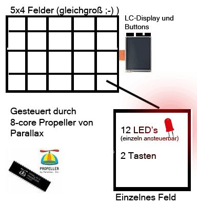Hey, ich würde gerne ein Spielbrett für eine Art Schiffe versenken bauen und möchte dabei wie im Anhang zu sehen ein LCDisplay, einige allgemeine Buttons, (bissl EEPROM) und 20 Spielfelder einsetzen. Jedes Spielfeld hat 12 unabhängige LED's und 2 Sensortasten, letztere sollen erstmal außen vor bleiben. Meine Hauptfrage ist jetzt: Wie kann ich kostengünstig und pinsparend die LED's ansteuern? (Ich weiß, doppelte Optimierung geht schlecht ;) ) 1 sinnvolle Idee hätte ich: Idee: Ich spendiere jedem Feld 16 Bit Schieberegister und kann so im besten Fall mit zwei Leitungen (Takt und Wert) zu jedem Feld auskommen. Ein SelectIC beim Prozessor sorgt dafür dass der Takt nur zum gewünschten Feld gelangt. (5 bit Feldauswahl, je 1 bit Takt und Wert sind 7 Pins) Leider finde ich diese Lösung mit den ganzen Schieberegistern sehr teuer, wenn ich mit ein paar Pins mehr etwas sparen könnte wäre das super. Im Forum werden häufig Matrizen verwendet, ob das für meine Zwecke sinnvoll ist weiß ich nicht. Eine Matrix über das ganze Spielfeld wäre nen ganz schöner Leitungswust ;) Eine Nebenfrage ist meine Prozessorwahl: Ich habe einen Parallax Propeller mit 8 Cores auf einem Chip gewählt, weil ich so gleichzeitig die Ansteuerung, die Spiellogik und die Grafik (128x64 Pixel) berechnen kann. Mit nebenläufiger Programmierung habe ich auch gut Erfahrung. Findet Ihr diese Überlegung richtig oder gibt es sinnvolle Alternativen? Bin für jeden Tipp und jede (bissl konstruktive) Kritik dankbar! MfG Matthias