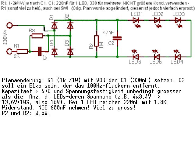 Hi, diese Schaltung ist vielfach und jahrelang im Dauerbetrieb erprobt. 1 LED: 220nF mehrere: 330nF, erst ab >40 LEDs in Serie 460nF. Elko: Mindestens 470nF, sonst ist der wirkungslos. Spannungsfestigkeit je nach Anzahl der LEDs ! ! mfg Triti
