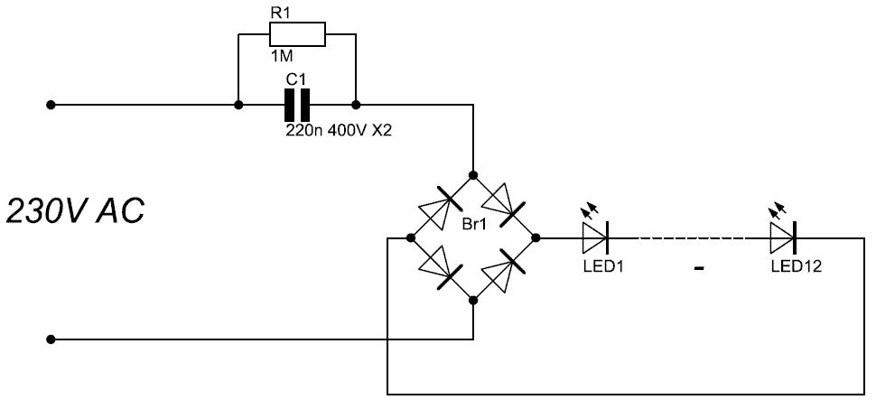 http://www.elektronik-kompendium.de/public/schaerer/cpowsup.htm Xc = 1 / (2 x PI x f x C) = 14468,6 Ohm kapazitiver Vorwiderstand Annahme: 12 weiße LEDs mit min. 3,2 V Durchlassspannung = 38,4 V I = (230 - 38,4) / 14468,6 = 13,2 mA effektiv zur Sicherheit mal den Maximalstrom: Imax = (325 - 38,4) / 14468,6 = 19,8 mA Damit das Ganze korrekt wird, müsste man noch die Zeit wegrechnen, wo die LEDs nicht leuchten (beim Nulldurchgang, wo die Spannung unter 38,4 V ist). Aber so überschlagsmäßig ist gegen die Schaltung nichts einzuwenden. PS. außerdem hab ich die Gleichrichterdioden vergessen :o) wer gröbere Fehler in meiner Näherung findet darf sie behalten.