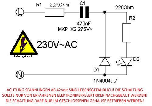 Was haltet ihr von der schaltung? http://blackstrom.derschwarz.de/schaltungen/blinkled230/index.shtml Das gute daran ist, dass man keinen teuren Netzspannungskondensator braucht.