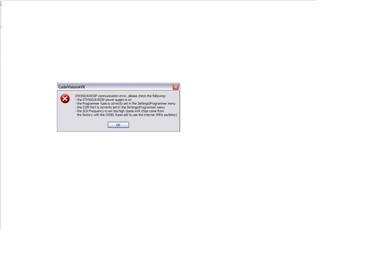 Hallo, wo siehst Du die Meldung mit com2? Das was angehängt ist deutet auf ein Problem zwischen stk500 und Zielprozessor hin (Spannung, quarz, Fusebiteinstellung und vor allem ISP Frequenz) Welchen Programmer hast Du angeschlossen? Und welchen Programmer hast Du in Codevision eingestellt? LG, Sabine