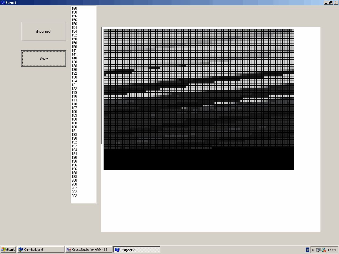 Moin Leute Ich möchte mit meiner C328R gerne ein Preview Bild machen. Diese Daten über einen ARM zum PC Schicken und im C++ Builder Darstellen.(vorgehen UMC328R seite12) Mein Problem ist jetzt wie ich die Ankommenden Bild Daten darstellen kann. Im Moment versuche ich die Bild Daten so wie sie sind von oben links Zeile für Zeile nach unten Rechts einzulesen(80*60). 1,2,3,4,5,6...80 81,82,......... . . Das ist wohl falsch. In welchem Format ist das Preview Bild?