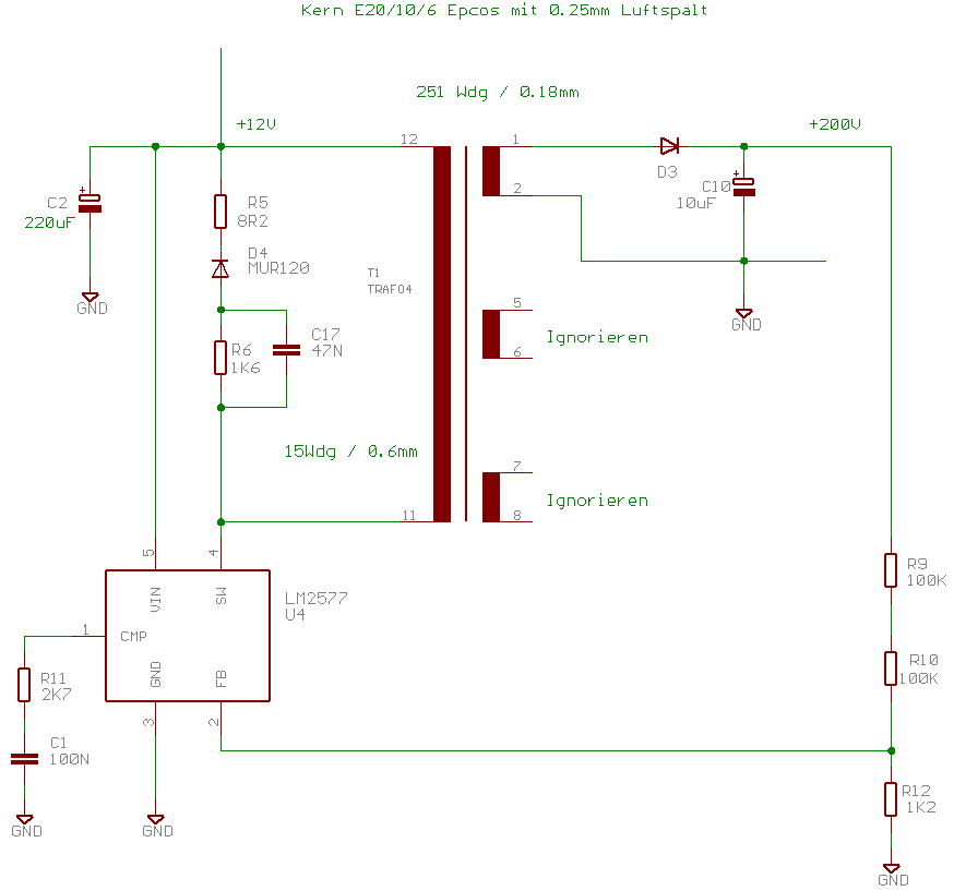 Verstehe den Aufwand den du hier betreiben möchtest nicht ganz... MAX1771 + spule (z.B. L-11P 330µ von Reichelt) + externen FET (z.B. IRF830, der ist ziemlich beliebt unter nixie bastlern) + diode (z.B. IN4937, besser noch eine schnelle Diode) Und fertig is... Das rum getue mit Übertrager, unpassenden Regler ICs usw endet bestimmt nur in Frustration.