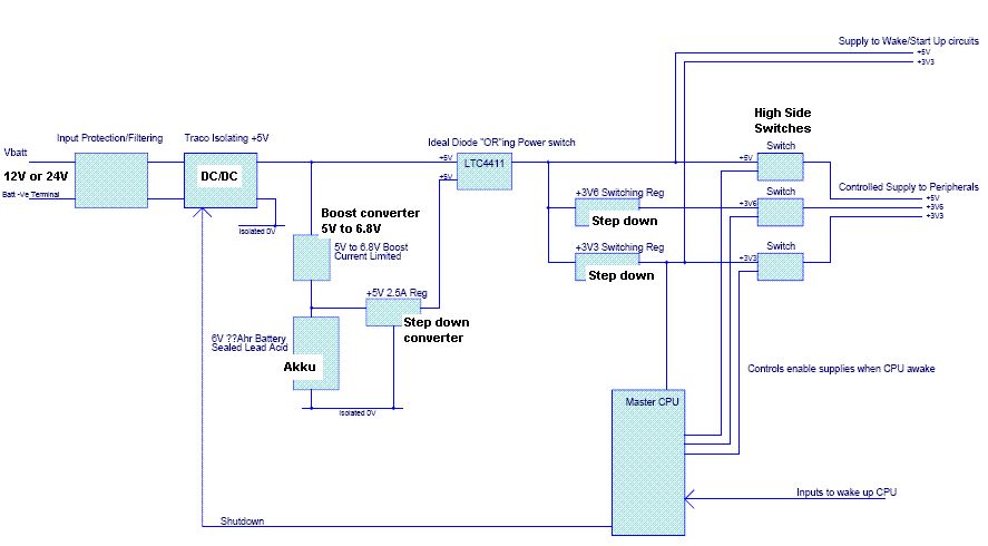 Hallo habe folgendes Problem: Ich soll fuer eine Automotive Anwendung mit einer Eingangsspannung von 12V / 24V ein Power Supply System mit Backup Batterie entwerfen. Primaer wird das Ganze vom Bordnetz versorgt. Sollte dieses ausfallen, so soll eine interne Backup Batterie die Schaltung weiter versorgen. Steht die Bordnetzversorgung wieder zur Verfuegung soll die interne Batterie geladen werden und die Schaltung versorgt werden. Die Schaltung mit all den ICs und Baugruppen braucht a) 5V mit relativ geringem Strom b) 3.6V mit hohem Strom (2A-3A) c) 3.3V mit hohen Strom (2A-3A) All diese Spannungen sollen schaltbar sein. Zusaetzlich brauche ich konstante (nicht schaltbare) 5V / 3.3V fuer ein wenig Logik, die nie ausgeschaltet werden soll. Wenn jemand Lust hat kann er sich ja mal das Design anschauen. Konstruktive Kritik ist jederzeit willkommen.