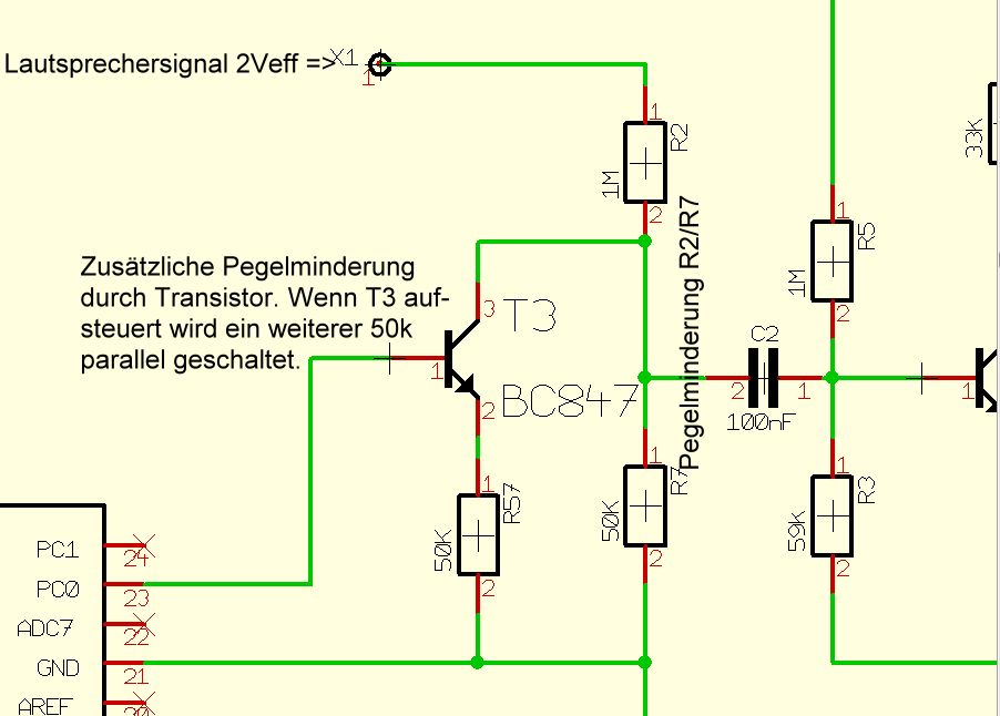 Hallo, laß in Deiner ersten Schaltung den Transistor ganz weg. Lege den 50k Widerstand von der Verbindung 1M/50k direkt zum Pin PC0. PC0 als Eingang ohne PullUp (hochohmig) kein zusätzlicher Teiler, PC0 als Ausgang auf L -> 50k an GND. NF-Spannung am 50k darf natürlich nicht allzu hoch sein, ist sie nach Deinen Angaben auch ja nicht. Kaputt geht auch bei höheren Spannungen nicht, 50k und die AVR-Schutzdioden verhindern daß, merkliche Verzerrungen gibt es auch erst ab ca. 3Vss am AVR-Pin, das wären aber dann 60V am oberen Teilerende... Gruß aus Berlin Michael