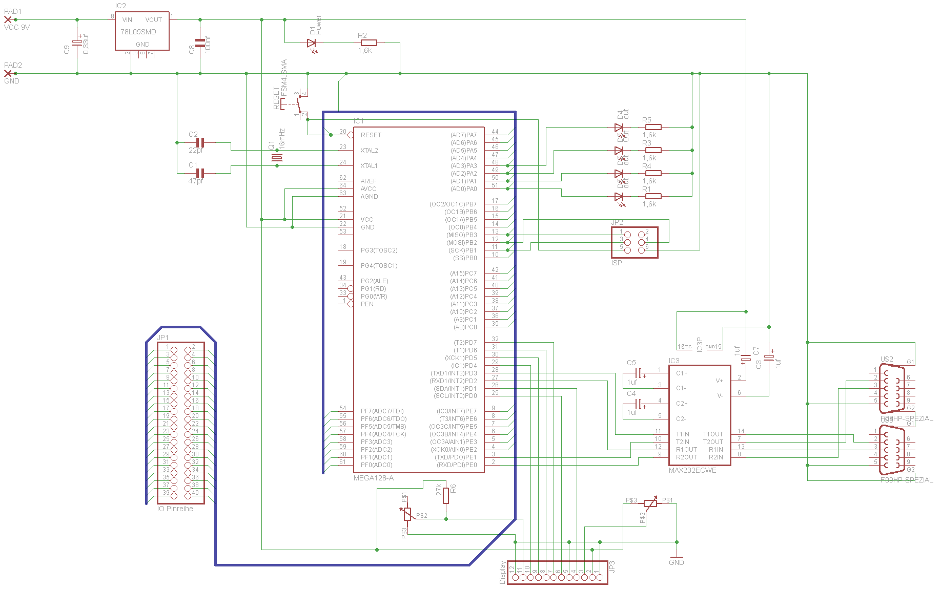 hallo, zum Proggen via ISP brauchst du die Pins Pin2 =PE0 MISO Pin3 =PE1 MOSI Pin11=PB1 SCK Pin20= Reset sollte so gehen AN PORT PE0,PE1 LIEGT DER UART0 DORT WÜRDE ICH DIE VERBINDUNG ZUM MAX TRENNEN WENN DU PROGRAMMIERST SONST KÖNNTE ES PROBLEME GEBEN mfg kay
