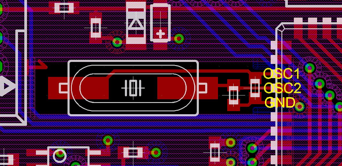 >b) Platzierung eines SMD-Quarzes UNTER dem IC, direkt zwischen den daran >anzuschließenden Pins. Könnte bei einem IC mit SMD-Pins sogar noch schlimmer sein, weil Vias idR. auch Impedanzänderungen mit sich bringen. >aber hat evtl jemand Erfahrungswerte? a) hat bei mir bisher immer funktioniert Im Layout sind ein paar Sachen zu beachten: 1) Stromschleife OSC1-C1-GND klein (EMV) 2) Stromschleife OSC2-C2-GND klein (EMV) 3) Stromschleife OSC1-XT-OSC2 klein (EMV) 4) Masserückleitung über GND-Pin (evtl. eigene Masse-Insel für Quarz) 5) unter dem Quarz nicht unnötig Signale durchführen (freistellen)