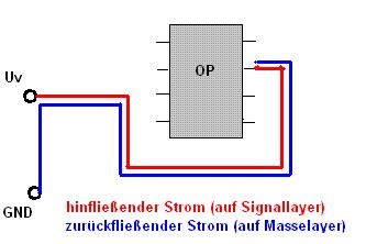>Was ich weiß ist, dass >der rücklaufende Strom versucht, quasi "direkt gegenüber" der >Spannungsleiterbahn zurückzufließen, Wer sagt das? Wenn Du eine Massefläche hast, fließt der Rückstrom geradlinig (= kürzester Weg) von der Lötstelle am GND-Pin des OP-ICs zur GND-Lötstelle und von dort in den Draht zum entsprechenden Pol der Batterie. Sollte sich auf dem geradliniegen Weg zufällig eine Aussparung in der Massefläche befinden, fließt der Strom drum herum. Ist die Massefläche keine Fläche, sondern ein Leiterzug, fließt der Strom entlang des Leiterzugs.