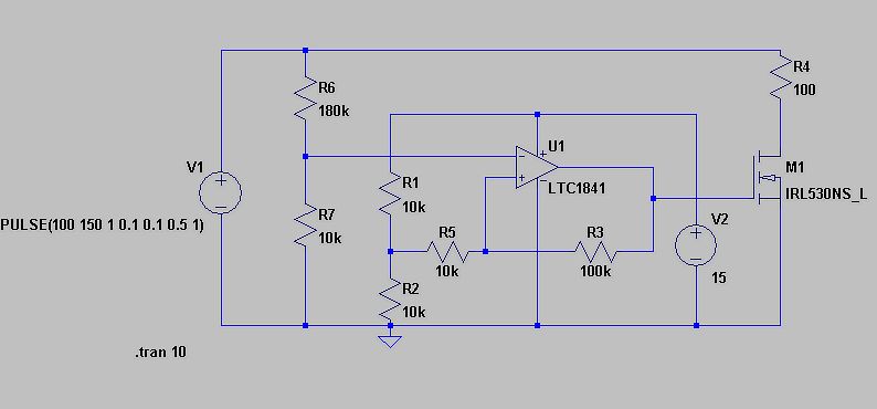 >Grösse der Hysterese : (ich dachte obere und untere grenze und die >Grösse der Hysterese sind dasselbe) Richtig, die Hysterese ist die Differenz ziwschen oben und unten. Das war eine kleine Fangfrage ;-) >die spannung sinkt so bald Vpulse auf 132 geht und >steigt wieder auf 120V sobald vpulse=120... Ich habe deine Schltung nachgemalt und simuliert. Mein FET im Bild schaltet ein wenn die Spannung unter den Schwellwert sinkt... So hätte ich das auch erwartet. Was hast du für Bauteilwerte?