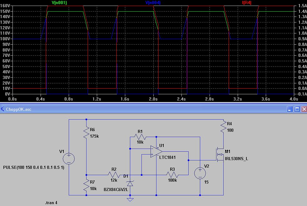 Also erstmal Danke. ich bin Student der eingentlich Nachrichtentechnick studiert mache aber gerade Praxissemester in Leistngselektronik wovon ich nicht sehr viel Ahnung habe.(dass zu erklären würde weit führen.) ich vesuche es die fragen die ich verstanden habe zu beantworten : bei 120V ist noch alles in Ordnung also wäre das ne untere grenze. ab 132V sollte der Bremschopper zum Einstaz kommen.(V4 eingeschalten ? ) Versorgungspannung für Treiber 15V. Grösse der Hysterese : (ich dachte obere und untere grenze und die Grösse der Hysterese sind dasselbe) Die Leistung die ich venichten soll (?) da ich es nicht weiss (weiss aber dass die motoren die an der Steuerung angeschlossen werden einen Nennstrom von 1.5A bis 5.5A) würde gerne wissen wie ich das berechnen kann. dasselbe gilt für die chopperfrequenz. ich habe(in meiner schaltung) V8 mit einer VPULSE quelle getauscht wobei die spannung Zwischen 120V und 132V sich periodisch ändert. ich messe die spannung am Drain und es scheint als ob der FET schaltet (die spannung sinkt so bald Vpulse auf 132 geht und steigt wieder auf 120V sobald vpulse=120. was ist falsch daran ?