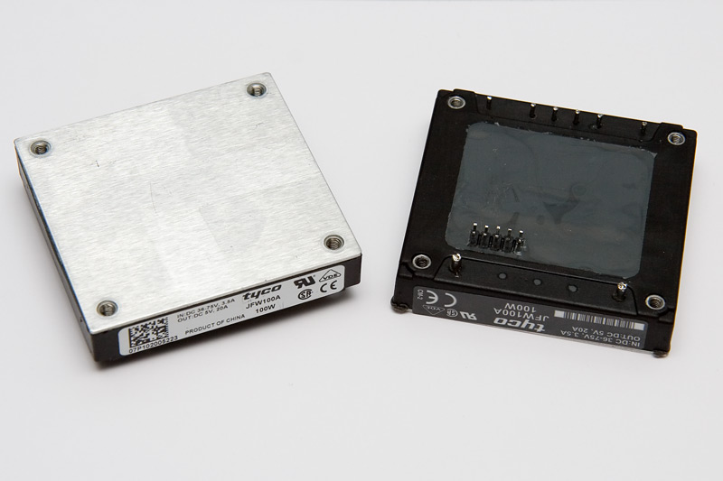Verkaufe zwei 100W DC/DC-Wandler von Tyco. Beide Wandler wurden aus Baugruppen ausgelötet und auf grundlegende Funktion geprüft (5 Minuten bei 100% Last). Eingang: 36V - 75V DC / 3,5A Ausgang: 5V DC / 20A Features: - kompakte Bauweise (61 x 58 x 13 mm) - primär- und sekundärseitige Remote-ON/OFF - Strommonitorausgang - Abgleich (Ausgangsspannung / Strombegrenzung) - 84% Effizienz - Sense-Anschlüsse - Power-Good Signal - Übertemperaturschutz Datenblatt: http://dareal.info/misc/jfw100a.pdf Beide Wandler zusammen für 35,- Euro incl. Versand per DHL-Paket. Kontakt per Forum / Antwort kommt dann per EMail!