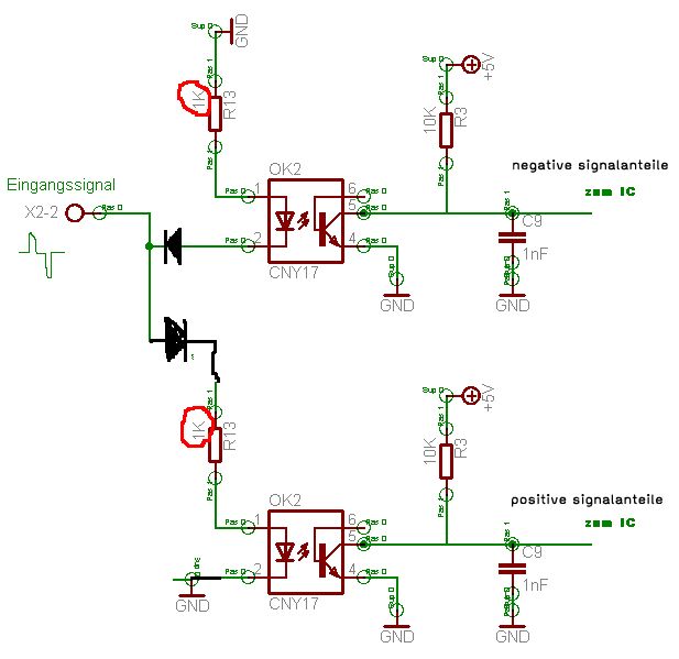 Hallo zusammen, bin ein Laie auf dem Gebiet der Elektronik, habe mich aber trotzdem mal an ein kleines ATMega8-Projekt gewagt. Jetzt stehe ich allerdings vor einem Problem, bei dem ich nun komplett auf dem Schlauch stehe. Über eine Eingangsleitung kommen Steuersignale in Form von positiven und negativen Spannungsimpulsen (+10V/-10V). Im Anhang seht ihr die funktionierende Variante der Schaltung. Das neg. Signal wird vom IC ausgewertet und das positive Signal wird ggfs. auf Masse geleitet. Jetzt suche ich aber nach einer Lösung für die umgekehrte Variante. Soll heissen, das positive Signal wird vom IC ausgewertet und das negative Signal wird ggfs. auf Masse geleitet. Die Auswertung des pos. Signal über den Optokoppler ist kein Problem (Anschlüsse tauschen). Aber - und das ist jetzt mein Problem, wie bekomme ich es hin, das der IC die Behandlung des neg. Signals steuern kann? Soll heißen, einmal soll es komplett abgeblockt werden und einmal soll es komplett auf Masse geleitet werden. Ich würde mich wirklich sehr über eine Hilfestellung freuen. Gruß Werner