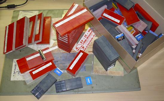 Da ich mir nun für zu viel Geld ein Mäuseklo-Set gekauft habe, verschenke ich an den ambitionierten Bastler meine bisherigen Behältnisse. Es handelt sich um Kästchen in denen Wendeschneidplatten im Maschinenbau geliefert werden. Da ich da Beziehungen habe, habe ich die leeren Behälter geschenkt bekommen. Die Dinger sind aus einem zähen Kunststoff ähnlich der Tupperware. Sie haben überwiegend zehn abgetrennte Fächer pro Kästchen. Es sind aber auch welche mit 15 (asymetrischen) Fächern dabei. Der Deckel wird draufgeschoben, und dichtet die einzelnen Fächer sauber ab. Selbst die 0603 SMD Widerstände rutschen bei geschlossenem Deckel nicht in ein anderes Fach. Also ideal für SMD Bauteile. Es sind Behälter in verschiedenen Größen, aber jeweils einer Größe sind auch genug dabei, um komplette Sortimente unterbringen zu können : zB 14 Stück von den ganz großen, 22 von den kleinen grauen und so weiter. (Bild 2 siehe Größenvergleich der häufigsten Behältnisse mit einer Mignon-Zelle) Zudem sind jeweils die Kästchen einer Serie aufeinander stapelbar. Ich habe einige der Dosen bereits verwendet, die sind schon gereinigt. Die anderen sind noch etwas angeschmutzt. Das kann man aber leicht beseitigen, indem man sie einmal in einer Stofftasche bei kleiner Temperatur in der Waschmaschine wäscht. Nun zu den Bedingungen : Zu zahlen sind 3,90 für ein versichertes hermes-Paket. Ich gebe nur alles komplett her, da ich nicht fünf Dosen hierhin und drei Dosen dorthin usw. schicken möchte. Also alles oder gar nichts. Derjenige, der als erster in diesen Fred Interesse bekundet, erhält den Zuschlag. Also erst posten, dann Mailen ;-) Eventuell kann der Beschenkte dann ja auch eine Weiterverteilung organisieren, wenn er nicht alle Dosen benötigt (was wirklich unwahrscheinlich ist. Das sind nämlich wirklich viele). Nun nun Feuer frei !