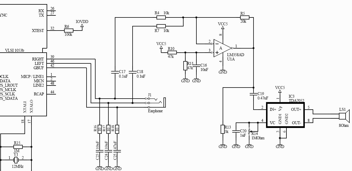 Hallo Matt ! Danke für die Antwort! Du hast recht, R5 könnt ich dann eigentlich weglassen und dafür R13 entsprechend dimensionieren. Hat die passive Mono->Stereo Umwandlung nur mir R4 und R7 auch (Qualitäts)Nachteile ? Oder merk ich das bei so einem kleinen Lautsprecher sowieso nicht ? Vielleicht sehe ich das einfach als Bestückungsoption vor. Zuerst mal rein passiv testen und dann eventuell aktiv mit dem OPV. Wobei mir gerade einfällt, dass ich wohl doch mit OPVs arbeiten muss. Will nämlich auch etwas einbauen um den Lautsprecher abschalten zu können. Das mach ich wohl am besten über einen Analogschalter vor einem Impedanzwandler. Die Beschaltung vom TDA stimmt so weit mit der im Datenblatt überein, diese hab ich auch 1:1 so am Steckbrett getestet. C20 und R14 sind fürs Einstellen der Verstärkung (ebenfalls von Seite 8 aus dem Datenblatt übernommen). Bist du dir sicher, dass man C19 einfach weglassen kann bzw. sollte ? Ich glaube mein Hauptroblem bei der Dimensionierung ist, dass ich nicht genau weiß was aus dem VS1053 rauskommt. Vpp sagt ja nichts über einen eventuellen Offset aus. Aber ich vermute mal, dass der Offset bei 1.23V liegt (GBUF liegt nämlich laut Datenblatt auf 1.23V) Schöne Grüße und besten Dank, Thomas