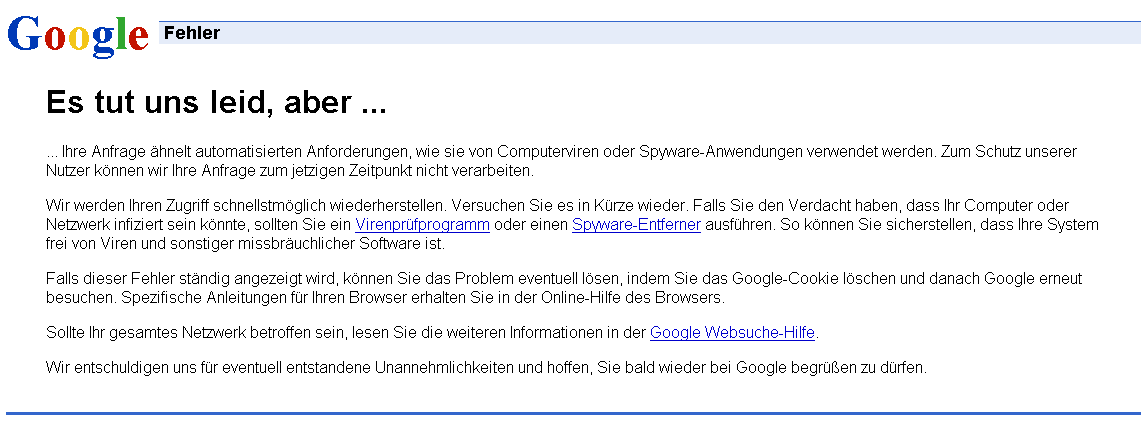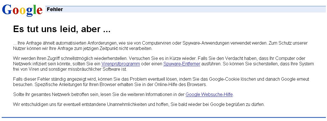 OK, ich hab die Lösung gefunden bzw. einen Anhaltspunkt. Es hängt anscheinend von der Domain ab. Andere Domain genommen und die Suche funktioniert ohne die besagte Fehlermeldung über viele Seiten hinweg. Weiß zufällig jemand ob es villeicht meta tags gibt, die google event. beachtet und dann so eine Fehlermeldung provozieren? Langsam wird mir google unheimlich ..
