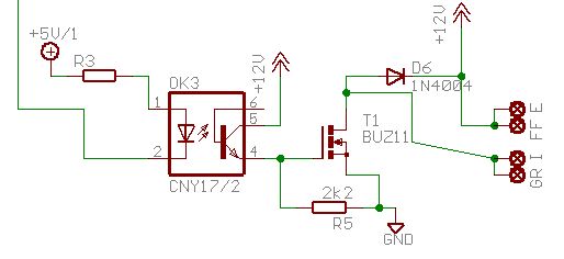 und bei welcher Frequenz läuft das ganze? Ist nicht gerade die ideale Treiberschaltung für einen MOSFET, da der aktive Bereich nicht schnell genug durchfahren wird -> Gefahr der Überlastung des FET. Warum überhaupt Optokoppler? Galvanische Trennung kann ja kaum der Grund sein. Und für die Spannungsverstärkung 5V->12V gehts es ja auch mit Transistoren, OPs oder am besten für den FET mit speziellen MOSFET-Treibern, ist hier aber nicht erforderlich. Die einfachste Lösung dürfte ein Logic-level-Fet sein (auch wenn du den BUZ11 behalten willst). Der AVR hat einen pushpull-Ausgang, das ist wesentlich besser für den FET als deine Optokoppler-Mimik. Je nach Last geht es aber auch mit dem BUZ11 direkt am AVR (mit 10R gatewiderstand), auf jeden Fall, wenn du den AVR mit 6V statt 5V betreibst.