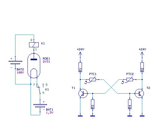 Hallo, habe hier mal zwei recht sinnfreie Schaltungen aufgemalt: 1. Eine Röhrendiode wird geheizt, nach einiger Zeit zieht das Relais an und der Heizstromkreis wird unterbrochen. Das Relais fällt nach einiger Zeit ab und das Spiel wiederholt sich. 2. Die Schaltung sieht ähnlich aus wie ein astabiler Multivibrator. Die Kondensatoren sind durch Kaltleiter ersetzt. Dies Schaltung sollte bei geeigneter Bauteildimensionierung eine Schwingung produzieren. Fallen euch ähnliche Schaltungen mit "modernen Bauelementen" die eine Schwingung erzeugen ein?