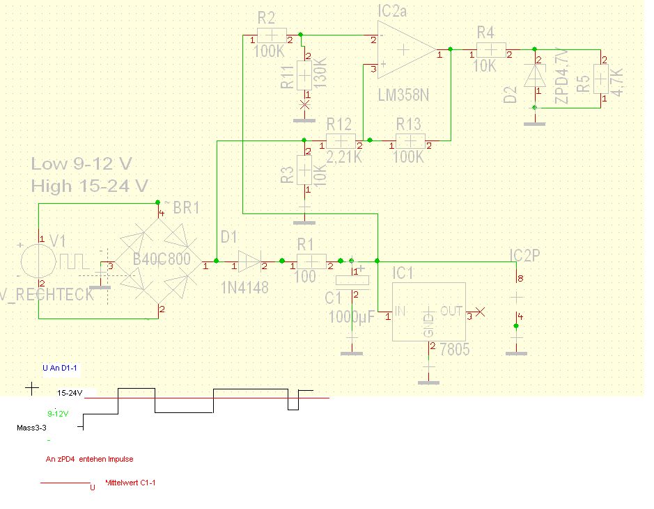 Hallo, Könnt ihr euch mal diesen Schaltplan ansehen. Es geht darum das aus einem Rechtecksignal ( ist eigentlich ein RS232 Signal mit Low 9-12 und High 15-24 ) die Versorgungspannung für verschiedene andere Bauteile zu gewinnen. Weiters soll aber das Rechtecksignal weiterhin genutzt werden, wie aus dem Schaltplan ersichtlich wird das Rechteck auf 5 V Pegel gewandelt. Meine Fragen nun. Ich glätte ja die Rechteckspannung mittels 1000µ Kondensator. Die Diode D1 brauche ich so denke ich halt damit sich bei einem Low der OP nicht die Spannung vom Kondensator holt ?? Richtig ? Weiters brauche ich eure Meinung nach den Pull Down R3 ? Anmerkung Brückengleichrichter dient nur zum Verpolungsschutz. Beim 7805 fehlen noch Stützkondenstaoren ich weiß. Vielen Dank erstmal christian