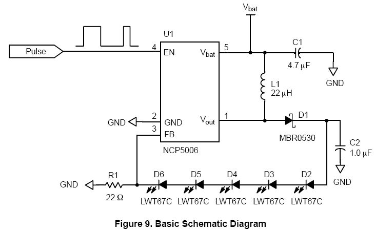 Hallo ! Für eine LCD-Hintergrundbeleuchtung verwende ich einen NCP5006 DC/DC-Wandler (Boost). Aufgebaut ist die Schaltung wie im Datenblatt (siehe auch Anhang). Verwende den EN-Eingang aber nur für das Ein-, und Ausschaltung der Hintergrundbeleuchtung, also keine PWM-"Modulierung". R1 ist bei mir 10 Ohm, d.h. ich habe einen LED-Strom von 20mA. Mein Problem: Bei 3.3V (VBat) funktioniert das ganze einwandfrei. Erhöhe ich aber die Spannung auf ca. 3.5V schaltete sich der NCP5006 scheinbar aus. Dreh ich die Spannung wieder zurück (am Labornetzgerät) geht die Beleuchtung wieder an. Kann mir nicht erklären wieso er das macht. Für mich wirkt es wirklich so, als würde sich der NCP ausschalten, denn die Spannung am Ausgang für die LEDs sinkt auf 0V. Hab ich im Datenblatt irgendetwas übersehen ? Schöne Grüße, Thomas