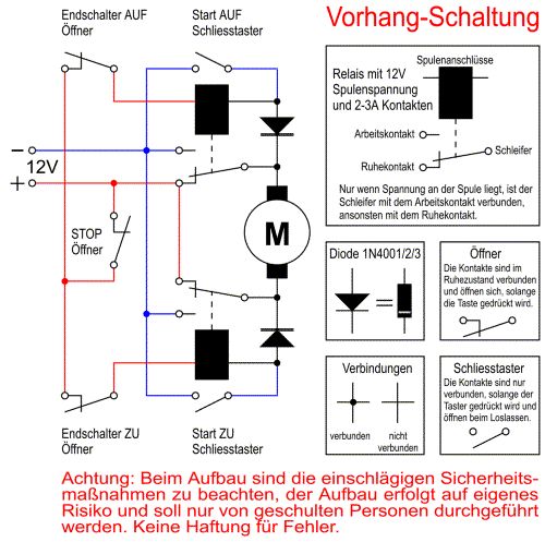 Sven, Schau Dir mal IN RUHE diese Schaltung an. Ist etwas trickreich. Ist zwar für einen Vorhang, macht aber genau das was Du willst. Hat 2 Endschalter, Taster für auf/zu/stop, macht die Motorumpolung und die Selbsthaltung. Funktioniert einwandfrei, die läuft bei mir im Heimkino. Jochen Müller