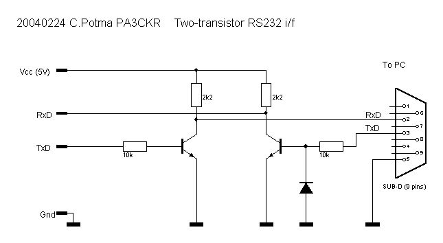 Vielen vielen Dank für die Hilfe! Hat mir echt weitergeholfen..Das einzige was mir noch unklar ist, ist der Pegelwandler mit den zwei Transistor-Invertern. (ich will den MAX232 nicht verwenden) Hab im Internet eine Schaltung gefunden.(--> siehe Dateianhang oder http://www.qsl.net/pa3ckr/bascom%20and%20avr/rs232/index.html) Könnte es mit so einer Schaltung funktionieren? Irgendwie verstehe ich die Schaltung aber auch nicht ganz..was für Transistoren muss ich verwenden? (also welchen Typ? und welchen genau?) Welche Spannungspegel brauche ich überhaupt? Also der µC hat für logisch "1" den Pegel +5V und für logisch "0" 0V, oder? Soweit ich weiß, ist bei der ser. Schnittstelle der Pegel 12V, kann mich aber auch irren. Welche Spannungspegel brauche ich jetzt auf der anderen Seite, damit ich vom µC zum PC etwas schicken darf?(und umgekehrt!) Wie dimensioniere ich dann die Wiederstände? nochmals Danke!! mfg
