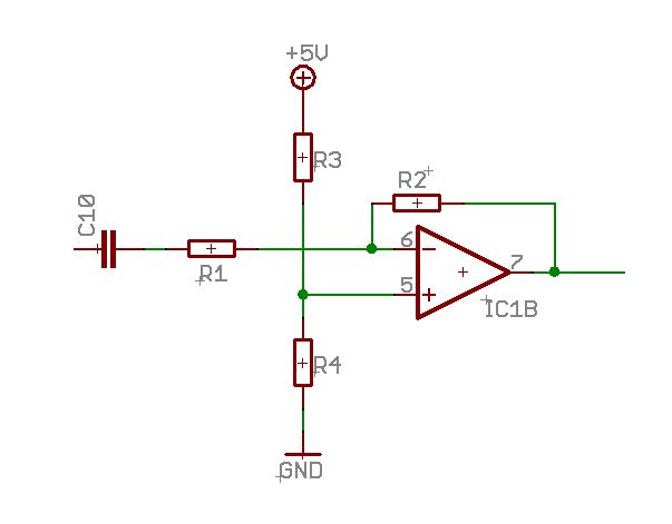 >Und woran hänge ich den R1? Wie bekomme ich das Eingangsignal auf den >Mittelwert 2.5V? Lass den R1 weg - wurde schon gesagt. Der DC-Anteil stellt sich der OPA selber so ein, dass am +IN dieselbe Spannung liegt wie am -IN. Mach einen Teiler R10 und R11 und schließe die Mitte sowohl an den +IN des einen OPAs als auch den +IN des zweiten an. Ein C parallel zu R11 wurde auch schon genannt. So kannst du für den zweiten Kanal IC1A verwenden.