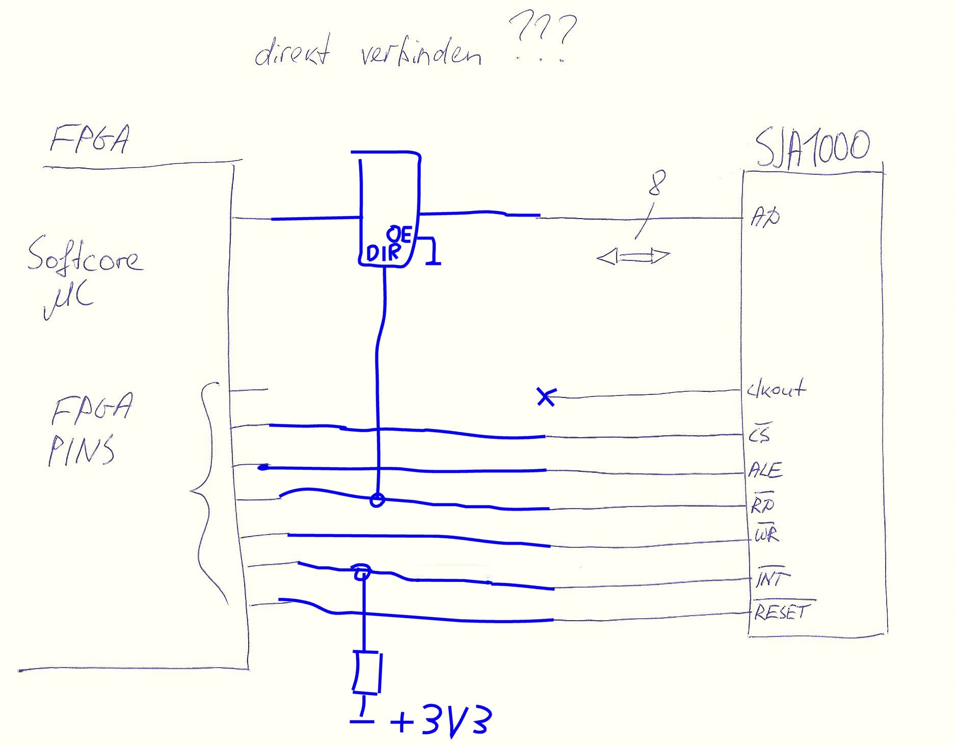 Hallo Alle zusammen! hab eine Frage: ich beabsichtige mein SoftCore-µC(im Xilinx Spartan 3 FPGA) mit dem CAN-Controller SJA1000 zu verbinden(s. Skizze). Nun weiß ich nicht, ob es direkt ohne weiteres gemacht werden kann. Bei normalen µControllern ist es ja kein Problem, da die Pins bereits über entsprechende Treiberschaltungen geschützt sind, bei dem Softcore sind jedoch die Leitungen einfach über die FPGA-Pins nach außen geführt. Hat jemand eine Idee diesbezüglich? ps: die Pegelunterschiede (3,3V <-> 5V) werden natürlich mittels Levelshifter angepasst