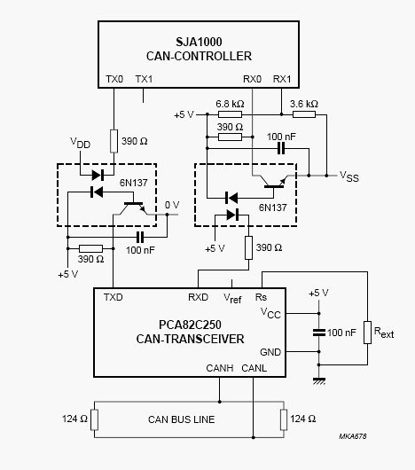 Schau Dir mal die Seite 12 vom Datenblatt des PCA82C250 an, da gibt es ein Schaltungsbeispiel (wobei der Transceiver selbst aber nicht galvanisch getrennt ist, aber alles dahinter).