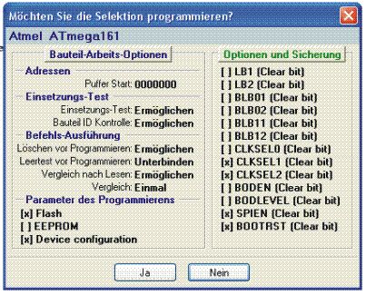 Hallo Leute! Also beschäftige mich jetzt schon längere zeit mit PICs und will jetzt auch mal ein wenig mit AVRs arbeiten! Als Programmiergerät verwende ich den SmartProg von Elnec. Mein erstes kleines Programm schaut genau so aus: include "m16def.inc" Init: ldi r16, 0xFF ;Port B durch Ausgabe von 0xFF ins out DDRB, r16 ;Richtungsregister DDRB als Ausgang konfigurieren ldi r16, 0xFF out PORTB, r16 ;PORTB auf 0xFF setzen -> alle LEDs aus Main: sbi PORTB,0 cbi PORTB,0 rjmp Main Aber es passiert genau garnichts! Am Oszilloskop müsste der PORTB,0 Pin ja ein Rechteckssignal ausgeben oder? Aber er ist nur auf Low! Der 2Mhz Quarz den ich am Chip betreibe schwingt aber schön brav, sieht man im Oszzi. Angehängt habe ich den Screenshot der Fuse bits, da ich mir mit denen nicht so ganz sicher bin ob die so stimmen... Vielleicht könnt ihr mir da mal schnell weiter helfen. Danke MfG Martin W